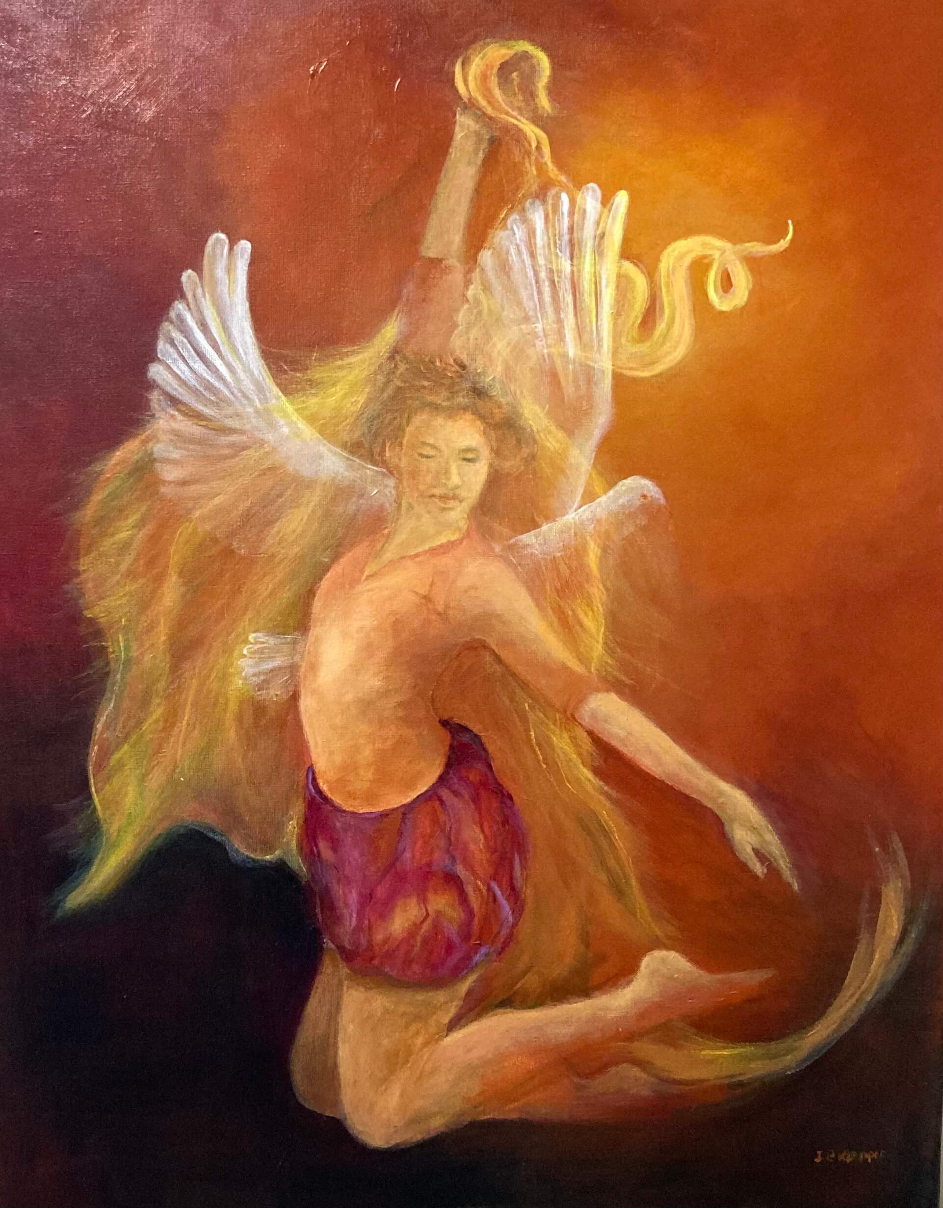 Een bijzonder schilderij dat zegt: Hoe zwaar het soms ook kan zijn, er is altijd overwinning mogelijk door de kracht van de Heilige Geest. Daarom is de Geest als een witte duif door de danseres heen geschilderd. Hij beweegt als het ware door haar heen. In Zijn kracht kan ze dansen. De rode achtergrond verwijst enerzijds naar het bloed maar vooral naar de liefde van Jezus.