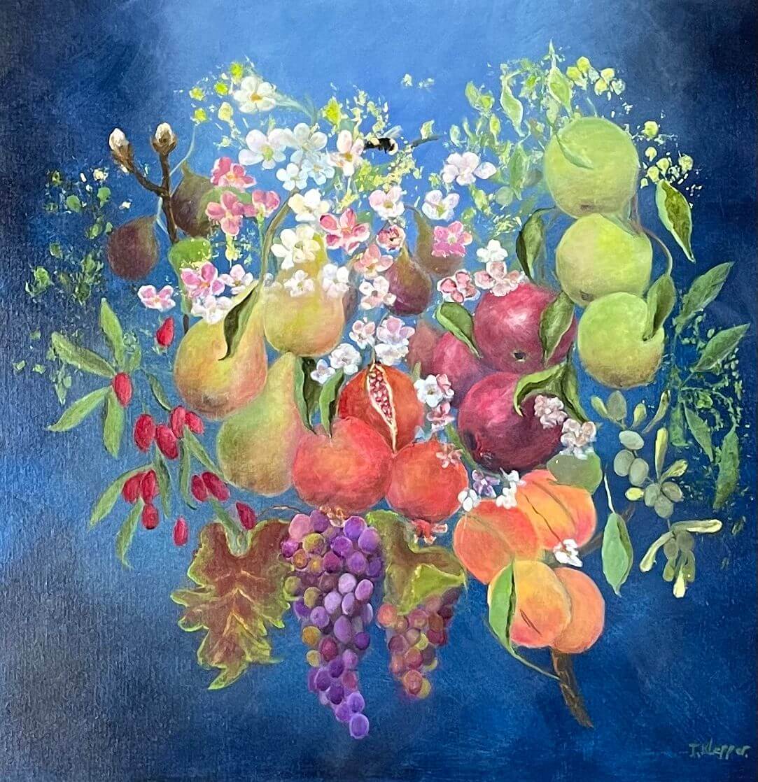 Ik heb het proces willen schilderen: De vruchten van de Geest zullen geboren worden, daarom zie je eerst de knop, dan de bloem. De bij staat symbolisch om ‘het samen’ en de eenheid te laten zien; Het elkaar bestuiven. De rode appel staat voor de liefde, de perzik voor de vreugde, de olijf voor vrede en overwinning, druiventros voor geduld, groene appel voor vriendelijkheid, de peer voor goedheid, granaatappel voor geloof, de vijg voor zachtmoedigheid, de nectarine voor barmhartigheid en de mirakelbes voor vriendelijkheid/vertrouwen